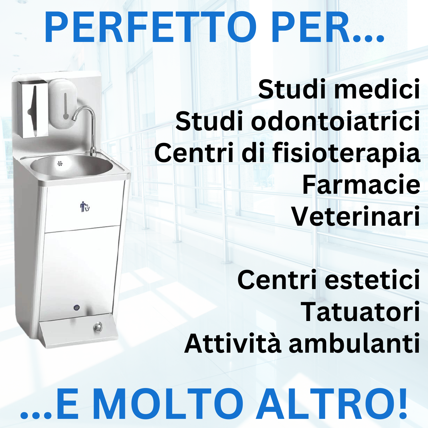 Questi lavelli autonomi sono autonomi da linea elettrica e idrica e si adattano benissimo ad attività come studi medici, ospedali, centri vanninali, fiere e sagre, chioschi mobili, scuole materne, centri estetici, centri fisioterapici, laboratori galenici, ambulatori medici e veterinari, centri tattoo, corner di bellezza, farmacie e profumerie, ambulanti alimentari
