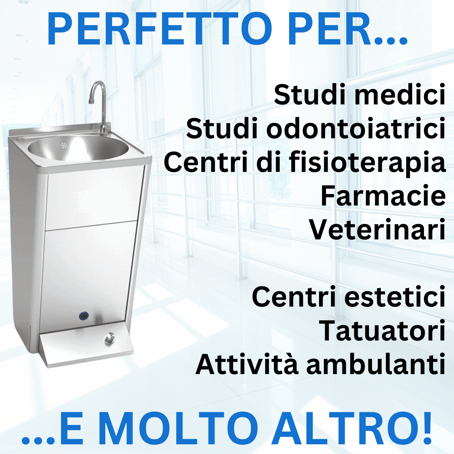 Questi lavelli autonomi sono autonomi da linea elettrica e idrica e si adattano benissimo ad attività come studi medici, ospedali, centri vanninali, fiere e sagre, chioschi mobili, scuole materne, centri estetici, centri fisioterapici, laboratori galenici, ambulatori medici e veterinari, centri tattoo, corner di bellezza, farmacie e profumerie, ambulanti alimentari