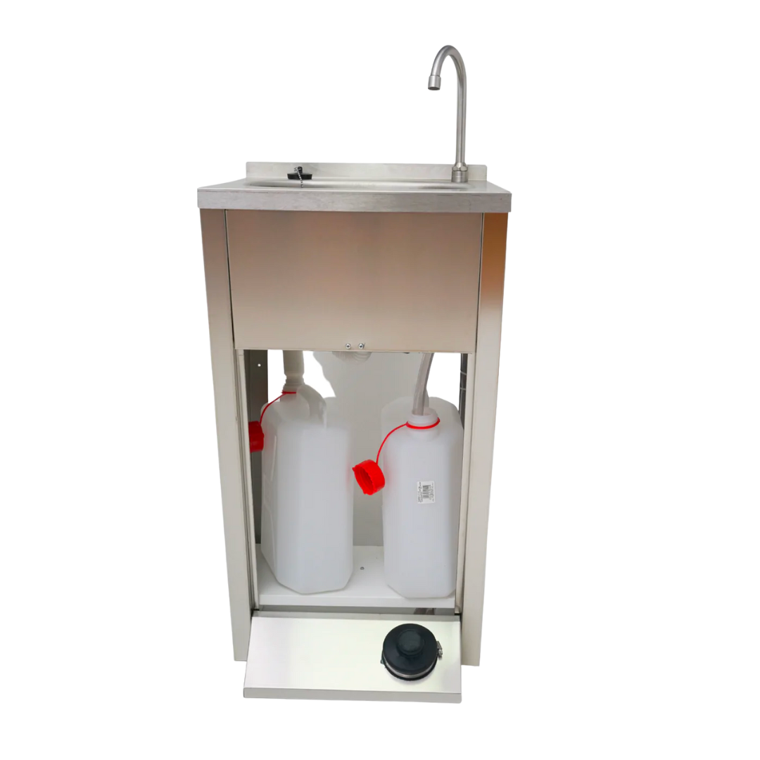 This self contained sink has a system that works by means of a hydraulic button that pumps water from one of the 10 liter tanks located inside, the other tank is for dirty water